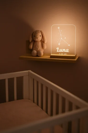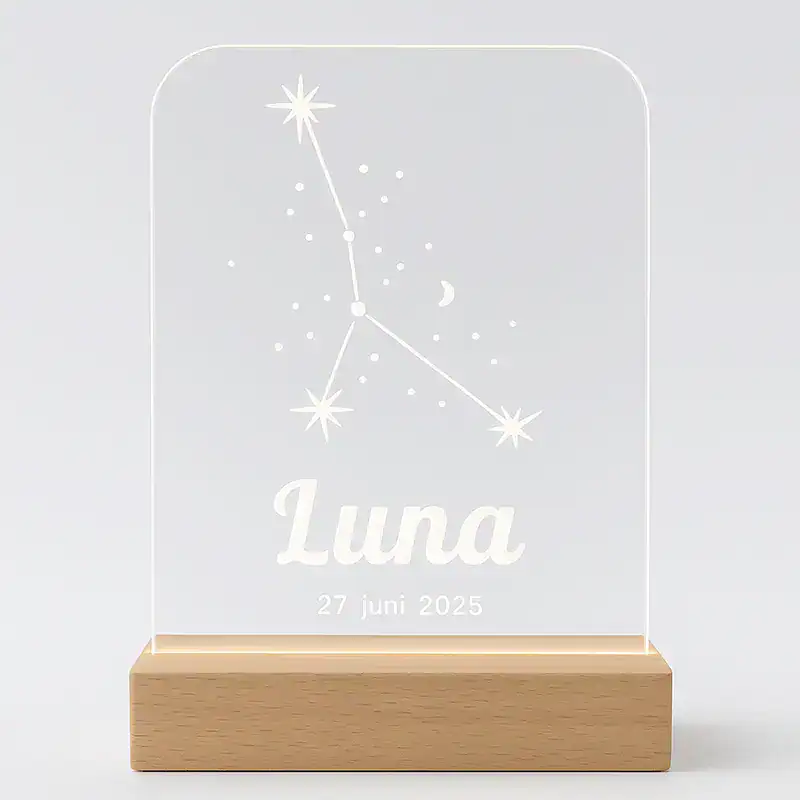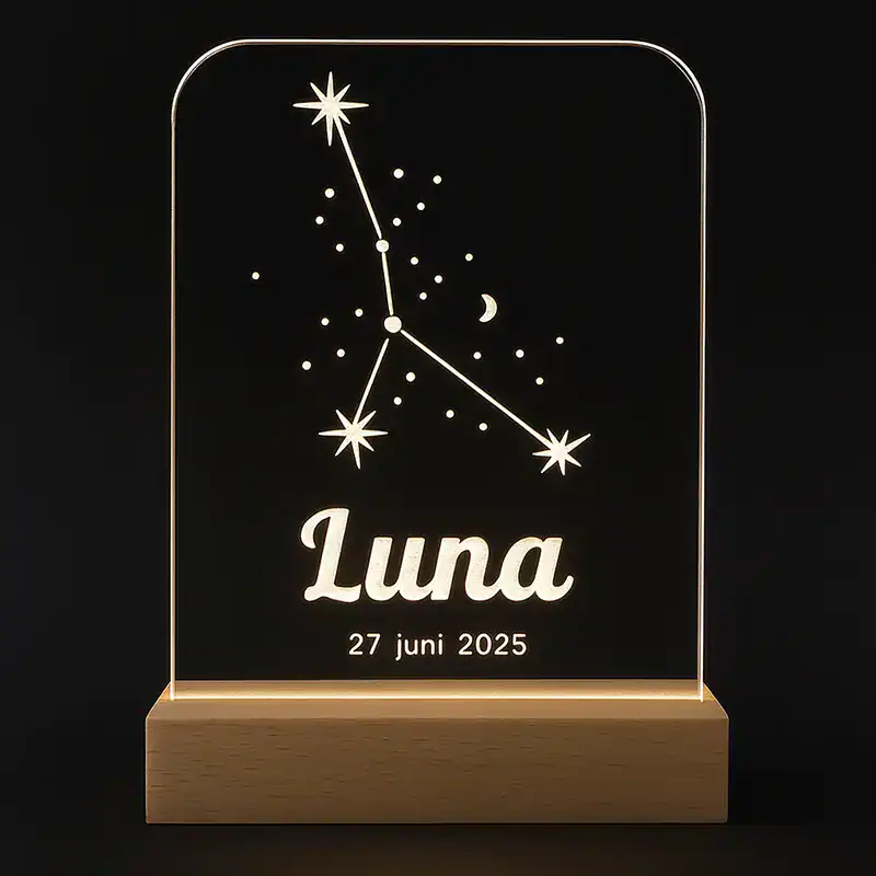 Breng magie in de kinderkamer met ons gepersonaliseerde sterrenbeeld lampje. Dit unieke LED nachtlampje toont het sterrenbeeld Kreeft, samen met een naam en datum naar keuze, elegant gegraveerd in helder acryl. Het warme licht zorgt voor een rustgevende sfeer, perfect voor baby’s en kinderen.